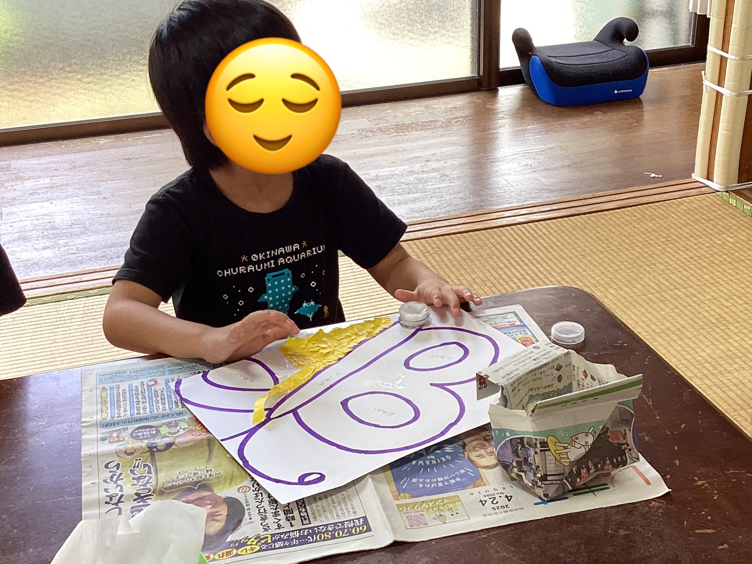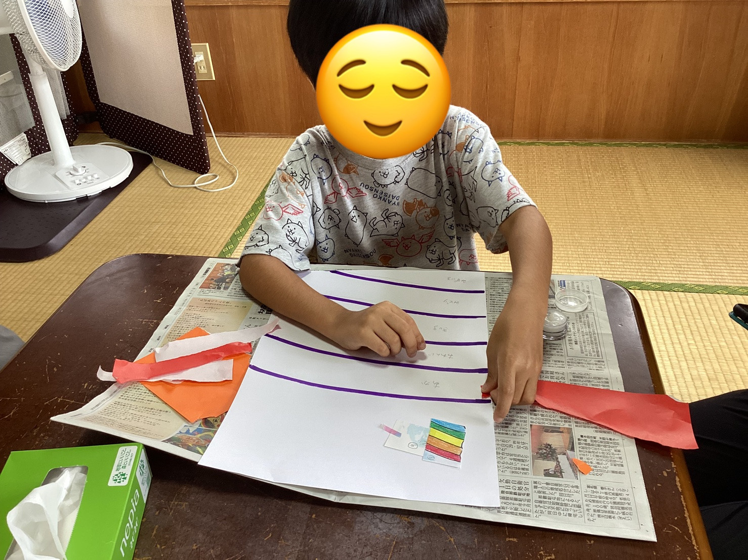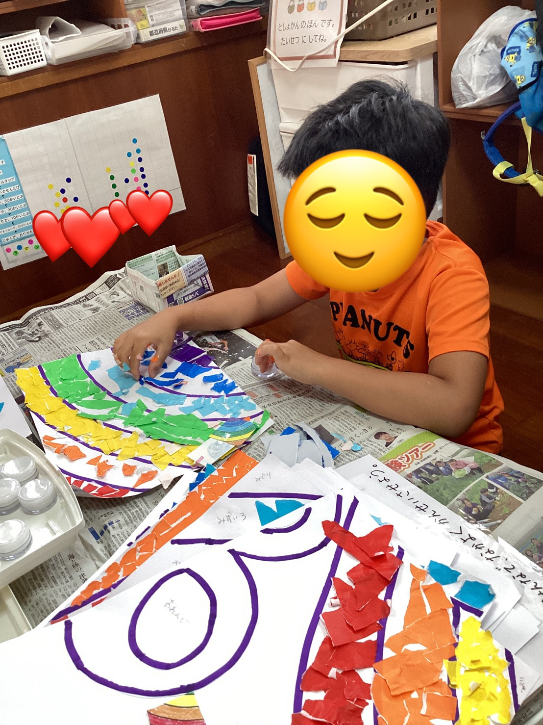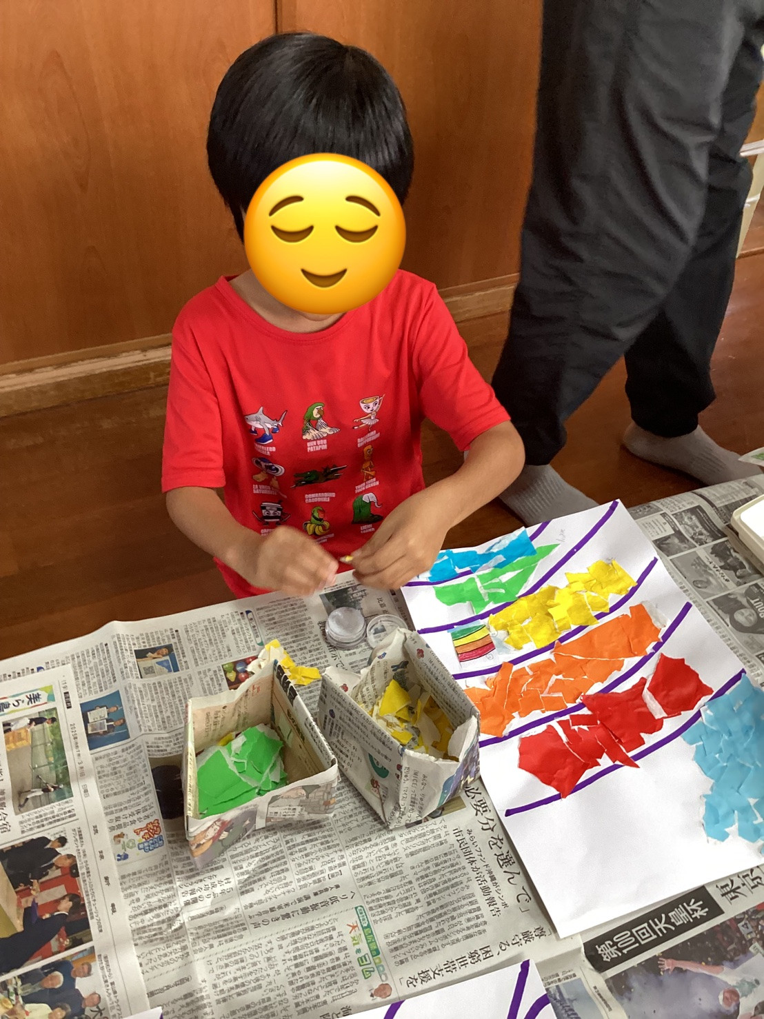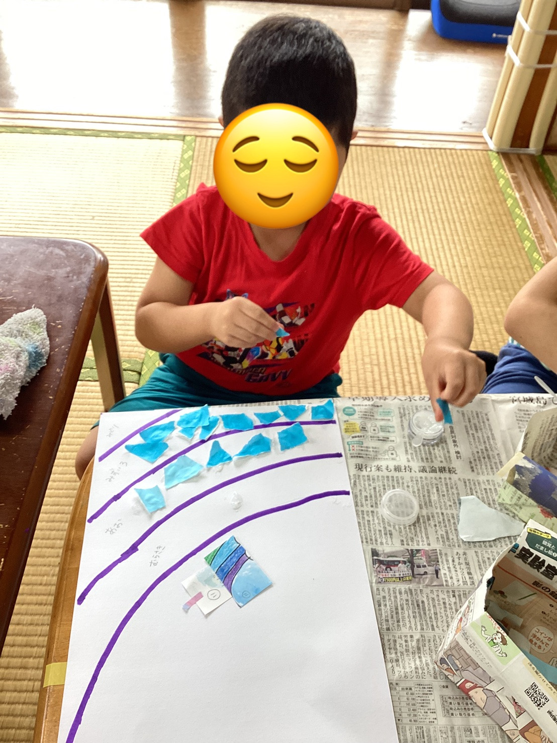 大きさの調整が難しく、早く終わりたいからと大きくちぎって貼ろうとする子もいたり、のりのベタベタが気に入らない子もいたりと、それぞれの得意不得意がみられました。